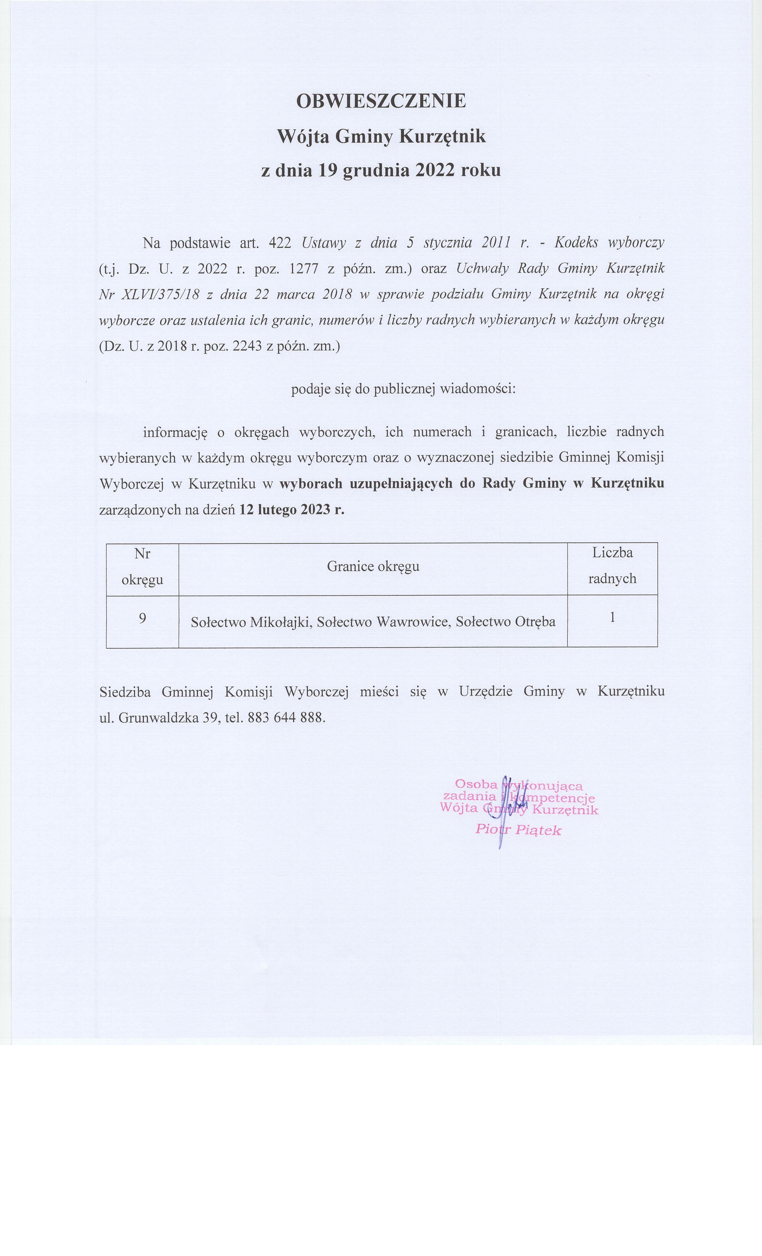 Obwieszczenie Wójta Gminy Kurzętnik z dnia 19 grudnia 2022 r. o numerach i granicach okręgów wyborczych, liczbie wybieranych radnych oraz o wyznaczonej siedzibie Gminnej Komisji Wyborczej w Kurzętniku