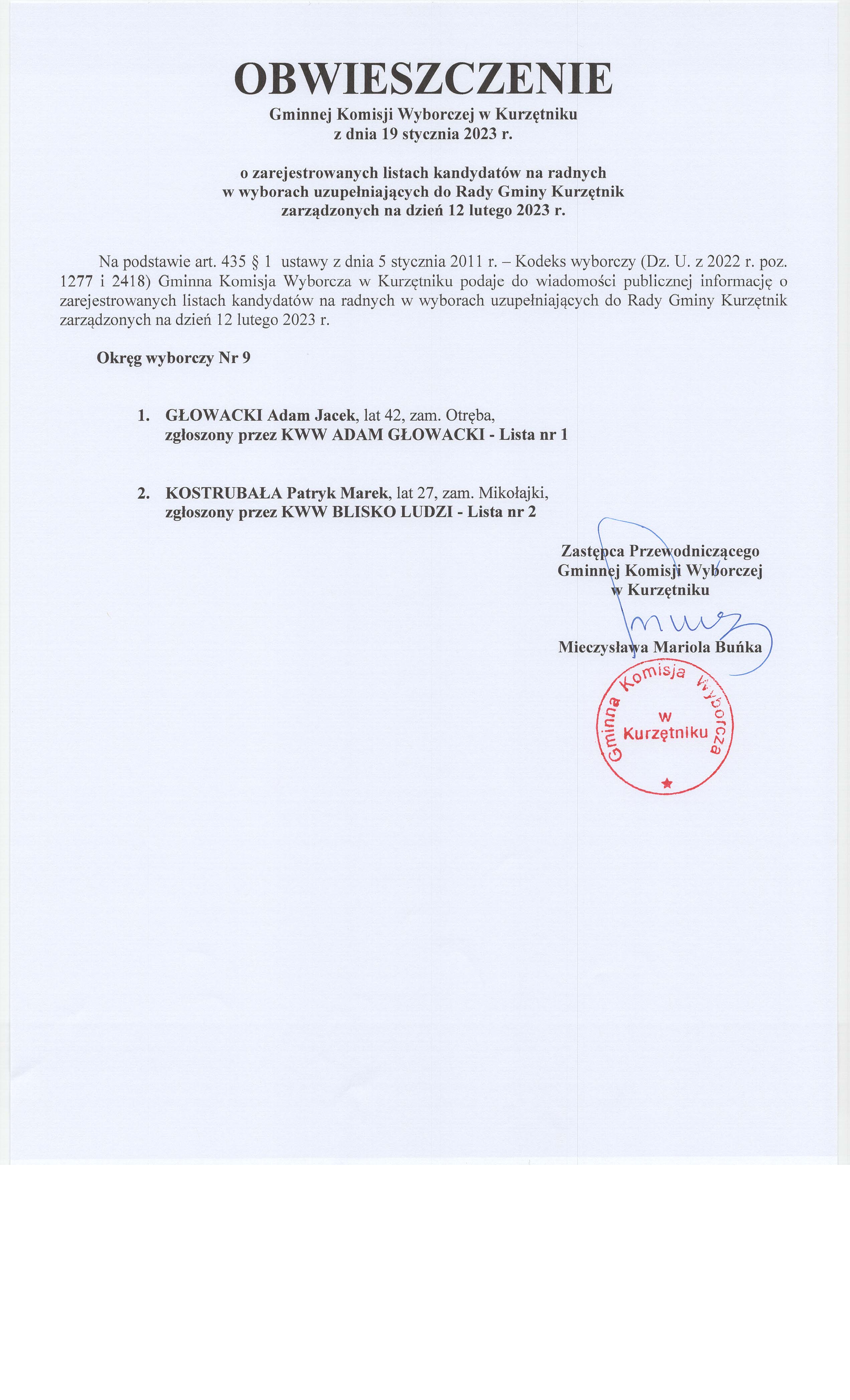 Wersja obowiązująca z dnia 23-01-2023 13:02:12 Drukuj Obwieszczenie Gminnej Komisji Wyborczej w Kurzętniku o zarejestrowanych listach kandydatów na radnych Załączniki Obwieszczenie Gminnej Komisji Wyborczej w Kurzętniku o zarejestrowanych listach kandydatów na radnych format: image/jpeg, rozmiar: 1 MB, data dodania: 23-01-2023 13:02:12