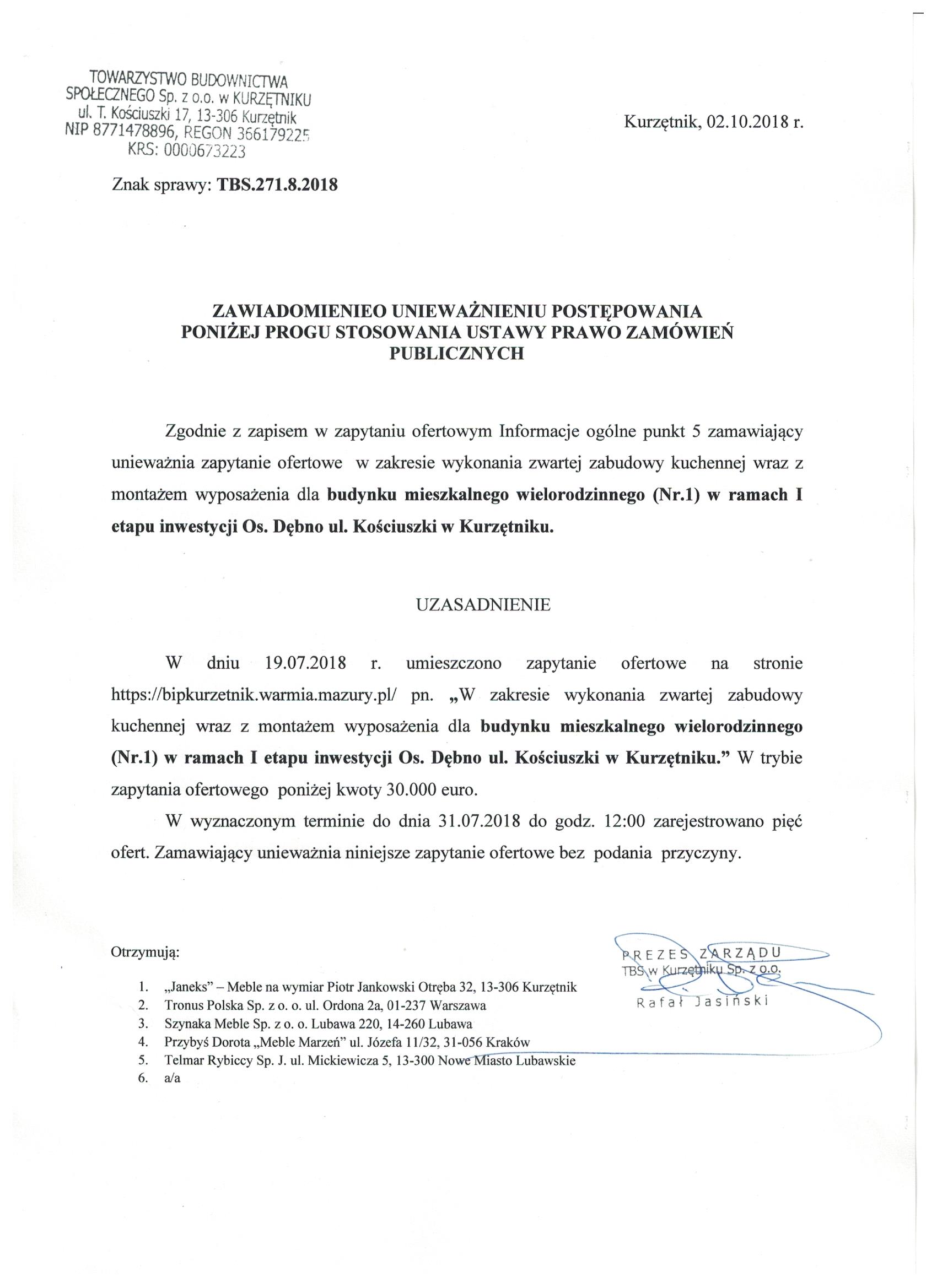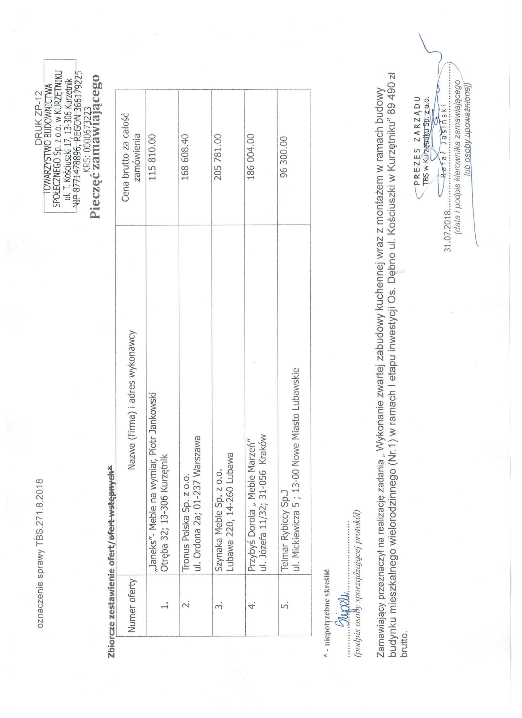 w zakresie wykonania zwartej zabudowy kuchennej wraz z montażem wyposażenia dla budynku mieszkalnego wielorodzinnego (Nr.1) w ramach I etapu inwestycji Os. Dębno ul. Kościuszki w Kurzętniku.