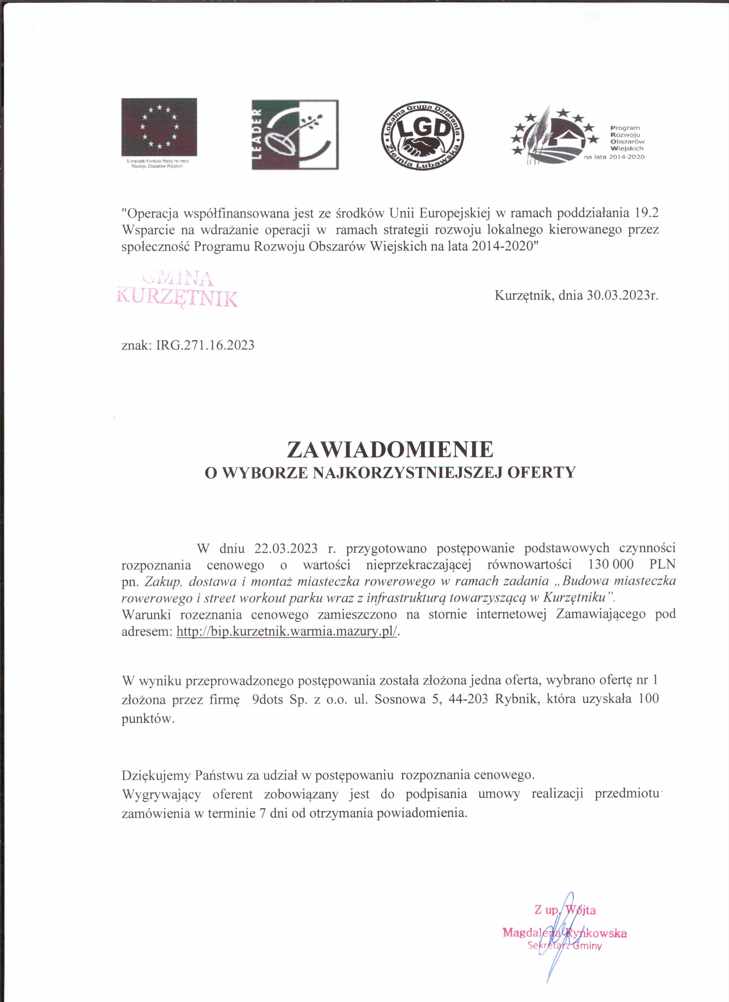 Zakup, dostawa i montaż elementów miasteczka rowerowego w ramach zadania "Budowa miasteczka rowerowego i street workout parku wraz z infrastrukturą towarzyszącą w Kurzętniku"